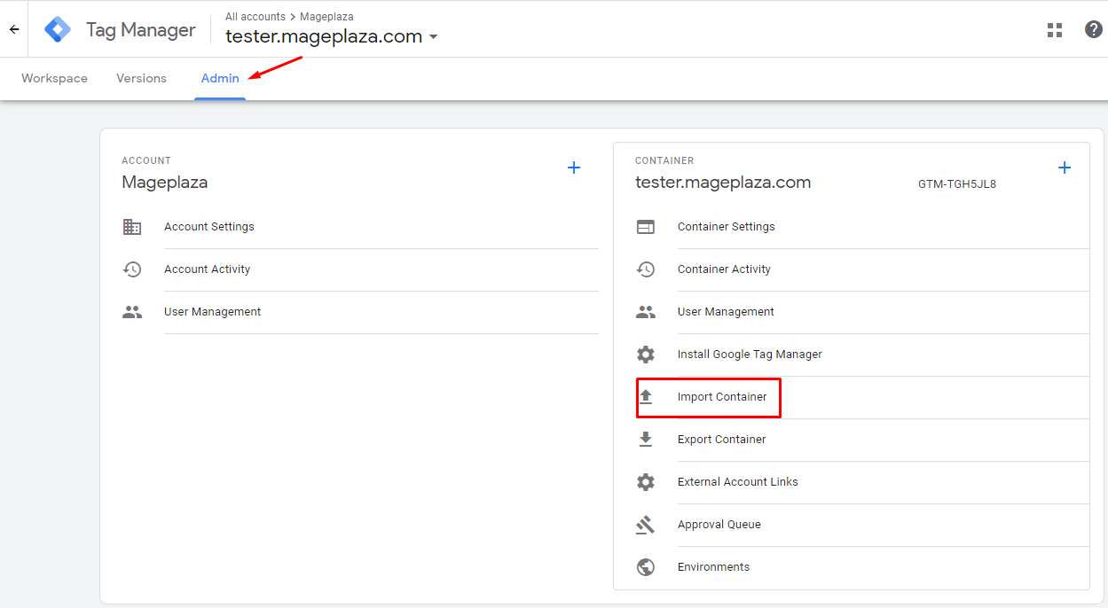 On the Google Tag Manager Admin page, click Admin and select Import Container