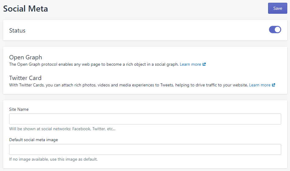 - Site Name: Enter the content to add the site name to the Social Meta tag